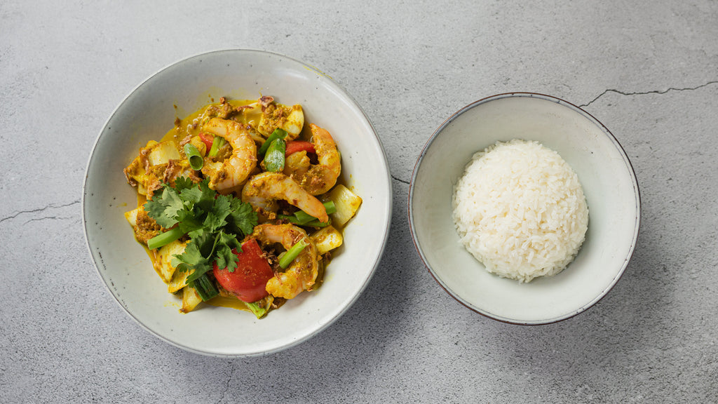 63. Stegt rejer med løg, peberfrugt og gul karry sauce - jasminris (Koong Pad Pong Kari)