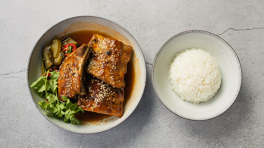 68. Braised pork spare ribs with cucumber salad - jasmine rice